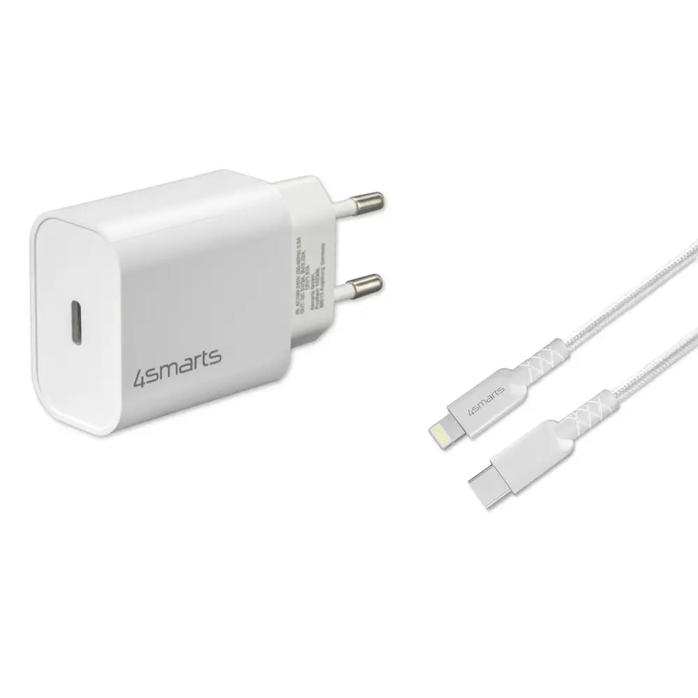 Schnelleres Laden: Das Set enthält einen integrierten Power Delivery Chip, der dein iPhone oder iPad extra schnell wieder auflädt.Qualität: Knickschutze an beiden Enden des Kabels sorgen dafür, dass du die leistungsstarken Funktionen länger nutzen kannst. Intuitiv: Sobald deine Geräte aufgeladen sind, wird der Ladevorgang beendet. Das erhöht die Lebensdauer des Akkus und senkt den Energieverbrauch.Kompakt: Findet problemlos Platz in jeder Reisetasche und ist damit der ideale Begleiter für deine nächsten Urlaubsreise.Daten: Das Kabel ist MFi zertifiziert und daher auch für das Synchronisieren von Daten geeignet.Technische DetailsVoltPlug:• Eingang: AC 100-240V (50-60Hz) 0,5A max.• Ausgang PD: DC 5V/3A, 9V/2.22A, 12V/1.67A• Abmessungen: 82x41x26 mm• Gewicht: 49,7gLieferumfang:1x Schnelles 4smarts Netzladegerät VoltPlug PD 20W1x USB-C zu Lightning Datenkabel ***MFi zertifiziertKompatibel zu allen mobilen Geräten mit Lightning.
