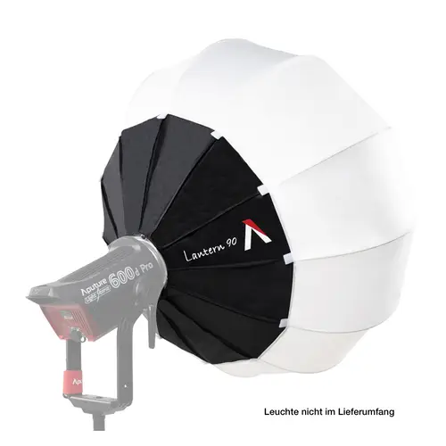 Unter der Nutzung des gleichen Designs wie die klassische Aputure Lantern, kombiniert die Lantern 90 das gleiche schnelle Aufbausystem mit einer noch größeren Oberfläche, um eine noch weichere volumetrische Lichtlösung zu bieten. Mit ihrem Durchmesser von 90 Zentimetern besitzt die Lantern 90 den gleichen Durchmesser wie der Aputure Light Dome II. Durch die größere Oberfläche kann die Lantern 90 große Flächen extrem schnell ausleuchten.Features:• Durchmesser 90cm• 1-stufige Stoffdiffusion• Lichtsteuerungsbezug aus Stoff• Schnell aufzubauen• Kompatibel mit Bowens Mount