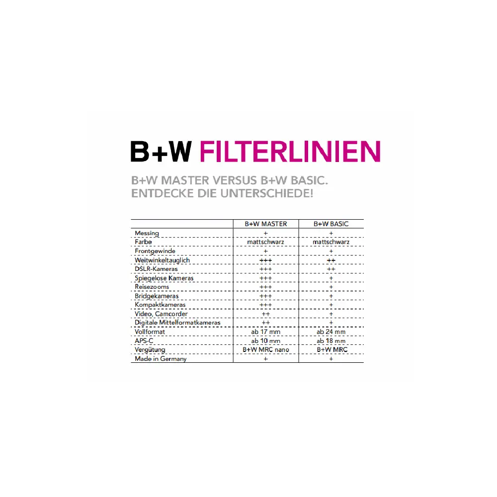 Die Fertigung aller B+W Filter erfolgt in Deutschland auf höchstem Niveau mit minimalen Toleranzen. Das Grundmaterial der Filterfassungen besteht aus Messing, ein Garant für hohe Stabilität und Langlebigkeit. Der spezielle Funktionslack erleichtert mit seinen optimierten Gleiteigenschaften das Ein- und Ausschrauben des Filters. Darüber hinaus garantiert eine exakte Glasauflage einen planen und spannungsfreien Sitz des Filterglases. Die Filter eignen sich für alle Brennweiten, einschließlich (Super)Weitwinkel- bis Teleobjektiv.