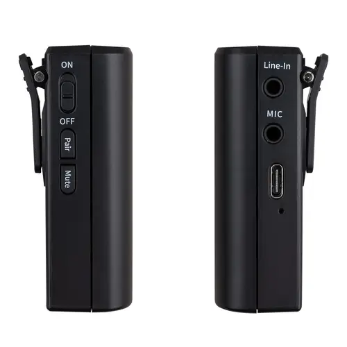 Der Funksender ist neben der Mikrofon-Eingangsbuchse mit einer zweiten Eingangsbuchse ausgestattet. An diese Buchse können Sie Audiogeräte wie Smartphone, Tablet oder MP3-Player anschließen und vorgefertigte Sprach-, Geräusch- oder Musikaufnahmen einspielen, welche dann anstelle des Mikrofons aufgenommen werden. Mit der „Mute“-Funktion können Sie Ihre Aufnahme kurzfristig unterbrechen bzw. stummschalten. Der Funksender ist ebenfalls mit einem Ansteck-Clip ausgestattet, mit dem Sie den Sender unauffällig beispielsweise am Gürtel oder am Hosenbund befestigen können.