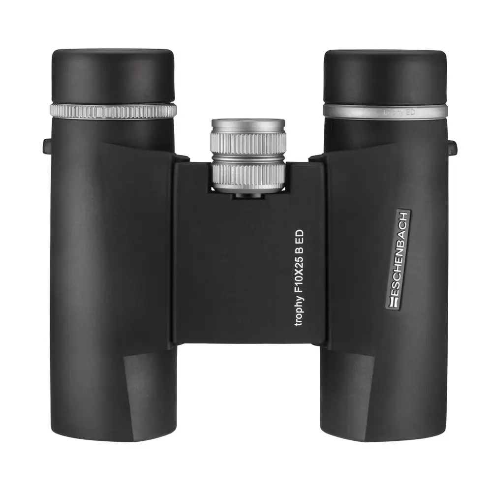 Hauptmerkmale• Platzsparend: Dank praktischer Faltbauweise findet das trophy F schnell und bequem in jeder Tasche Platz.• Besonders großes Sehfeld dank hochwertiger Weitwinkeloptik• Sehr hohe Farbtreue und besonders plastische Abbildung durch mehrschichtvergütete Hochleistungs-Linsen aus speziellem Extra- Low-Dispersions-Glas• Phasenkorrigierte BaK-4 Prismen mit dielektrischer Verspiegelung• Äußerst robust durch hochwertige Räder aus Metall und Magnesiumgehäuse• Volles Sehfeld auch für (Sonnen-)Brillenträger durch spezielle Okulare mit eindrehbaren Okularmuscheln.• Stickstofffüllung verhindert Beschlagen der inneren Optik bei Temperaturwechsel.• Wetterfest dank wasserdichtem Gehäuse.SPEZIFIKATIONENBauart: FaltfernglasVergrößerung: 10 xObjektiv-Durchmesser: 25 mmNahpunkt: 3 mGewicht: 330 gSehfeld m/1000m: 114Fernglasmaße (HxBxT): 102x113x42 mmPupillenschnittweite: 11Pupillendistanz: 35/75Austrittspupille: 2,5 mmGeometrische Lichtstärke: 6,3Dämmerungszahl: 15,8Prismen: BaK-4Vergütung: Mehrschicht-VollvergütungWasserdicht: JaStickstoffgefüllt: JaWeitwinkeloptik: JaBrillenträgerokulare: JaPhasenkorrigiert: JaExtra-Low-Dispersion Glas: JaLieferumfang1x trophy F 10x25 B ED Ww Fernglas1x Trageriemen1x Gürteletui4x Staubschutzkappen