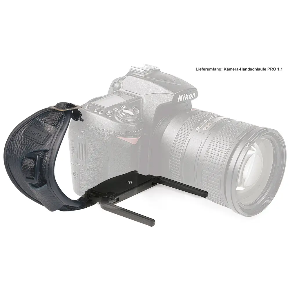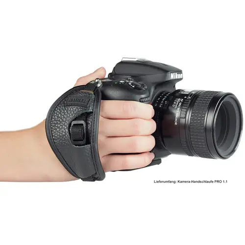 Die montierte Kamera-Handschlaufe erlaubt die zusätzliche Befestigung eines Kamera-Tragegurtes.