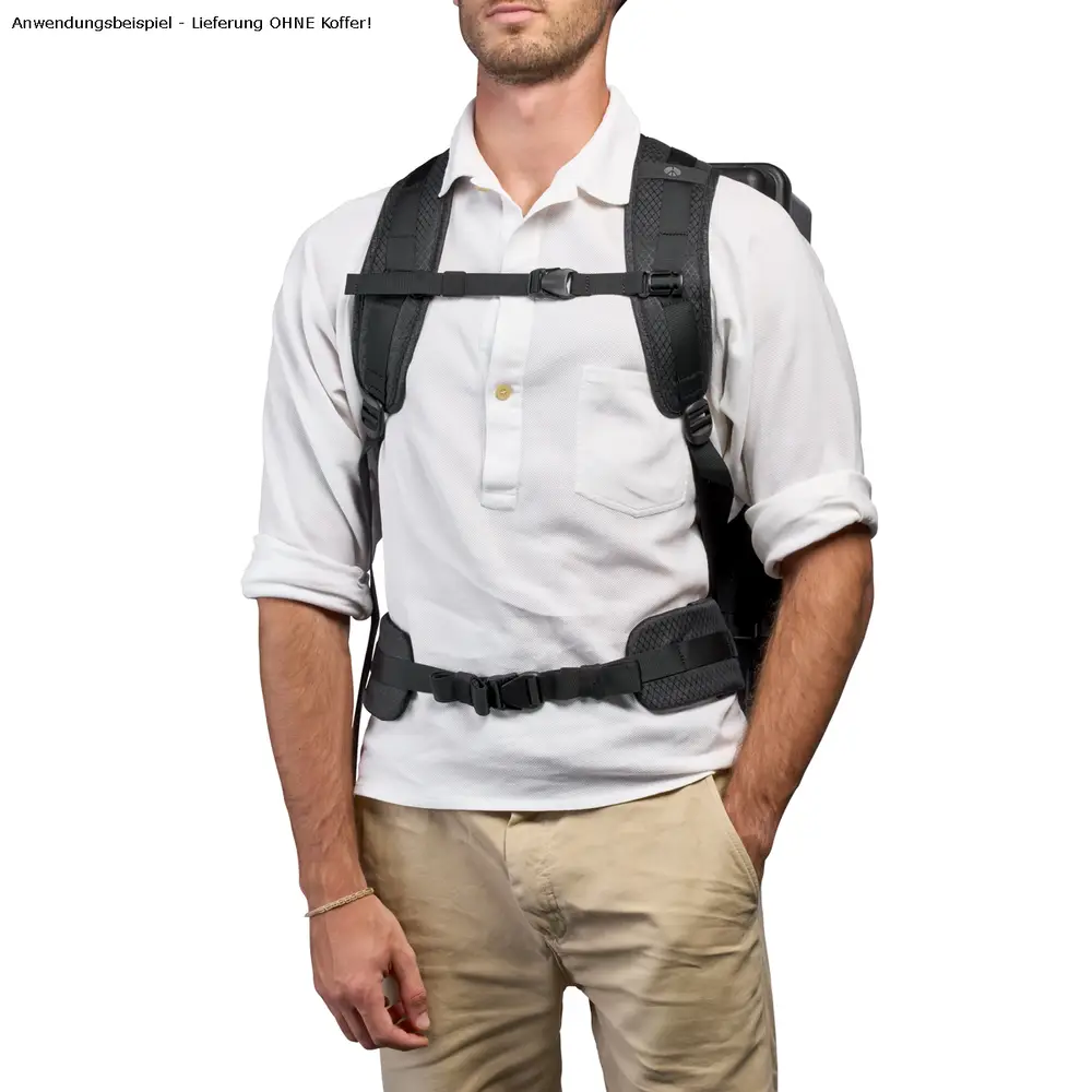 Durch 4 praktisch platzierte Metallstifte, die auf der Vorderseite der Manfrotto Tough Koffer positioniert sind, kann das Tough Gurtsystem einfach durch ein starkes und langlebiges verstellbares Gurtsystem verbunden werden, um Ihnen zu ermöglichen, den Tough Koffer wie einen Rucksack zu tragen.Dieses Tragesystem ermöglicht es Ihnen, das Tough Hartschalenkoffer in einen Rucksack umzuwandeln, wenn Sie die Tasche nicht auf dem Boden in unwegsamem oder felsigem Gelände rollen können, oder wenn Sie einfach schneller und beweglicher sein müssen. Das Gurtsystem ist mit einem Brustgurt, einem gepolsterten Hüftgurt und einem gepolsterten Rückenpanel ausgestattet, um den Komfort zu erhöhen. Zusätzliche Gurte mit Schnallenverschluss sind ebenfalls enthalten, die an dem geschlossenen, einziehbaren Griff für zusätzliche Stabilität und Gewichtsverteilung befestigt werden können. Alle Materialien sind wasserabweisend behandelt.Hauptmerkmale• Exklusive Transportlösung für Manfrotto Tough Hartschalenkoffer• Modulares Design, kompatibel mit allen Manfrotto Tough Cases• Verwandelt Manfrotto Tough Case in einen praktischen Rucksack• Gepolsterte Schultergurte für bequemes Tragen im Rucksackstil• Brustgurt + gepolsterter Hüftgurt für bessere GewichtsverteilungSpezifikationen Farbe SchwarzMaterial Nylon; SynthetikfaserLeergewicht 0,83 kgPlatz für Persönliches NeinStativhalterung NeinTaschenart TragelösungWasserabweisend JaAußenmaß (LxBxH) 27,5 x 7 x 50 cm