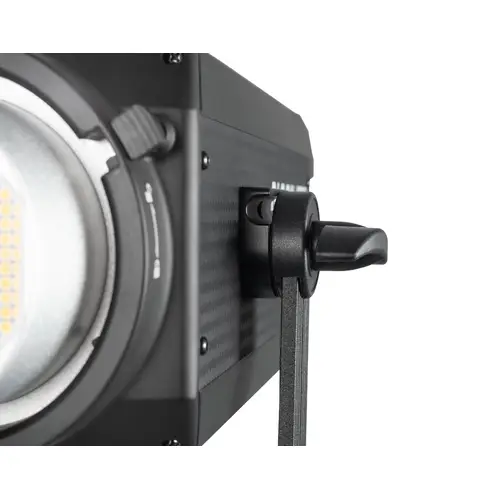 Scheinwerfer schwenkbar auf Montagebügel aus Aluminium. Befestigung auf geeigneten Stativen/Halterungen mit 16 mm (5/8“)-Normzapfen. Integrierter Schirmhalter.