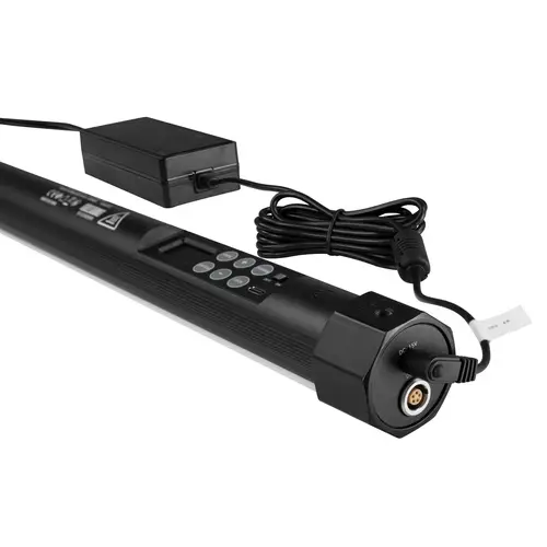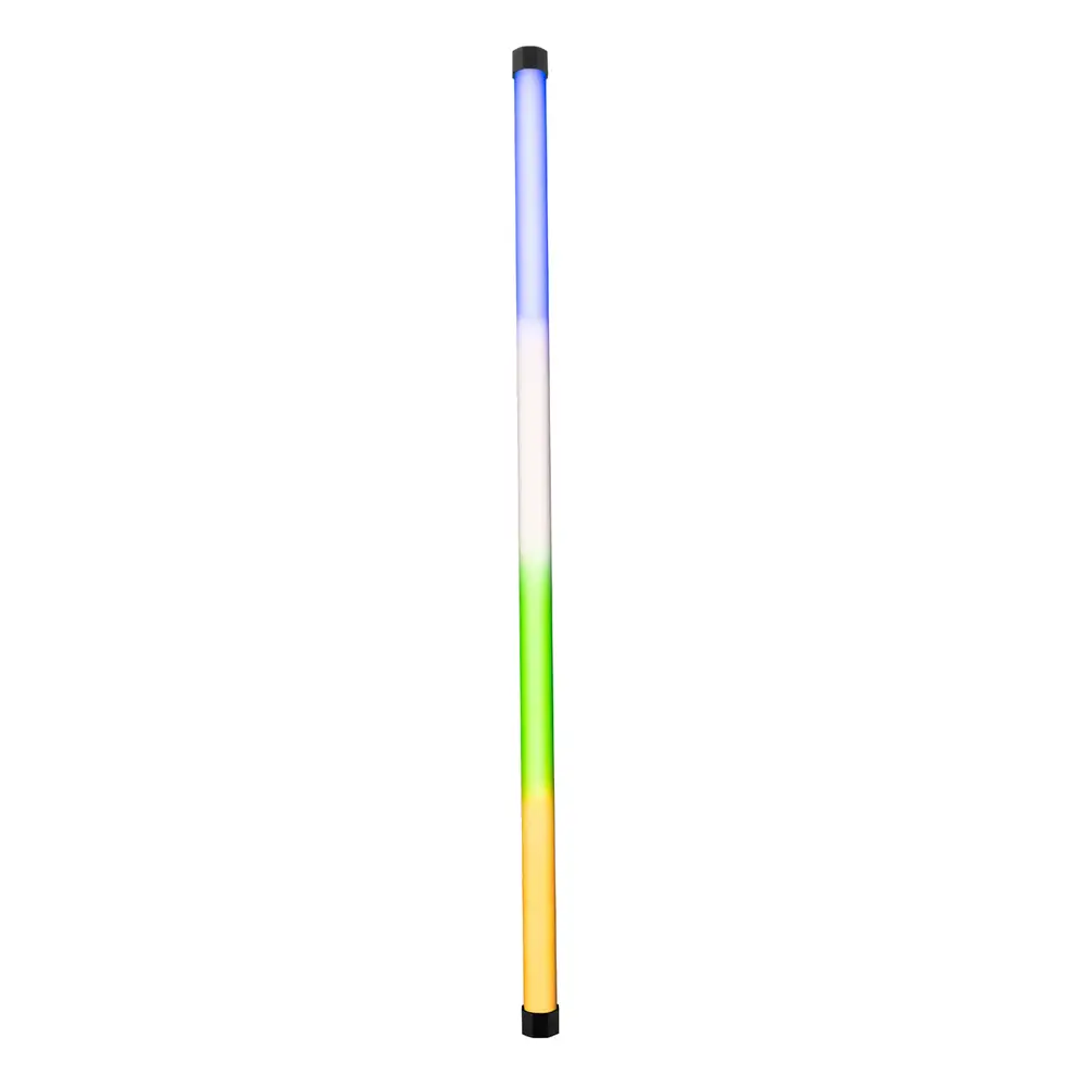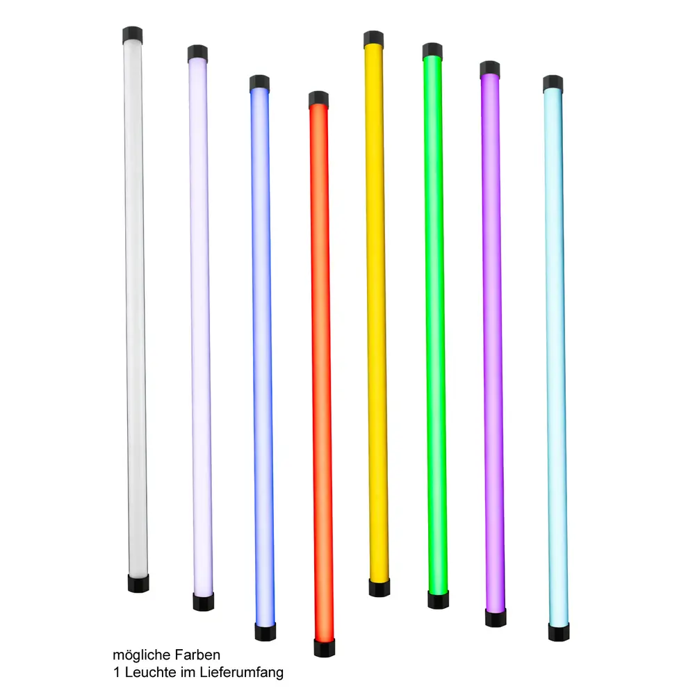 Multifunktionale RGBWW-LED-Farb-Effektleuchte in Röhrenform. Bietet die Beleuchtungsarten weißes Licht und farbiges Licht sowie besondere Spezialeffekte, inkl. Segment-Effekte. Direkte Steuerung oder Fernsteuerung über Bluetooth, Funk oder DMX/RDM. Wahlweise Netzbetrieb oder Akkubetrieb mit integriertem Lithium-Ionen Akku für den mobilen, netzunabhängigen Einsatz. Zahlreiche Befestigungs- und Handhabungsmöglichkeiten. Inklusive Netz-/Ladegerät, Befestigungszubehör und gepolsterte Transporttasche.