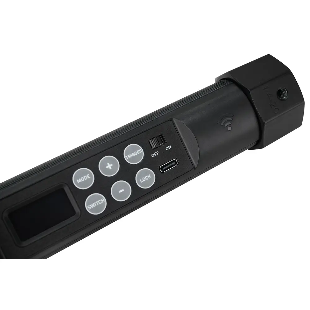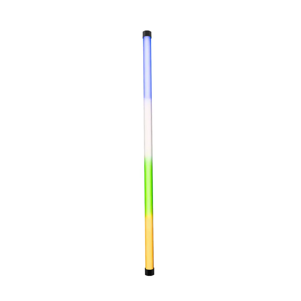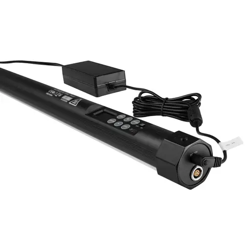 Multifunktionale RGBWW-LED-Farb-Effektleuchte in Röhrenform. Bietet die Beleuchtungsarten weißes Licht und farbiges Licht sowie besondere Spezialeffekte, inkl. Segment-Effekte. Direkte Steuerung oder Fernsteuerung über Bluetooth, Funk oder DMX/RDM. Wahlweise Netzbetrieb oder Akkubetrieb mit integriertem Lithium-Ionen Akku für den mobilen, netzunabhängigen Einsatz. Zahlreiche Befestigungs- und Handhabungsmöglichkeiten. Inklusive Netz-/Ladegerät, Befestigungszubehör und gepolsterte Transporttasche.