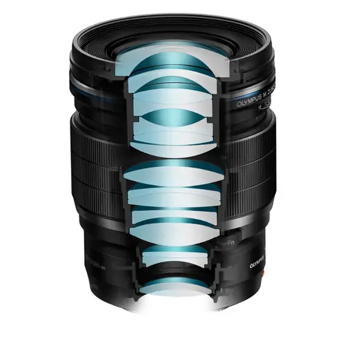 • 15 Linsen in 11 Gruppen (1 asph. Glaslinse, 1 Super-HR-Element, 3 ED-Linsenelemente, 1 ED-DSA-Linsenelement, 1 SED-Objektivelement)