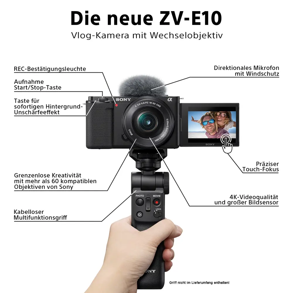 Die Funktionen dieser Vlog-Kamera von Sony bieten eine schnelle und intuitive Bedienung mit einem berührungsempfindlichen, seitlich schwenkbaren Bildschirm, einer Belichtungsautomatik, die Gesichter automatisch erfasst und diese immer gut ausleuchtet sowie einer Bokeh-Taste mit der sich der Hintergrund scharf oder unscharf stellen lässt.