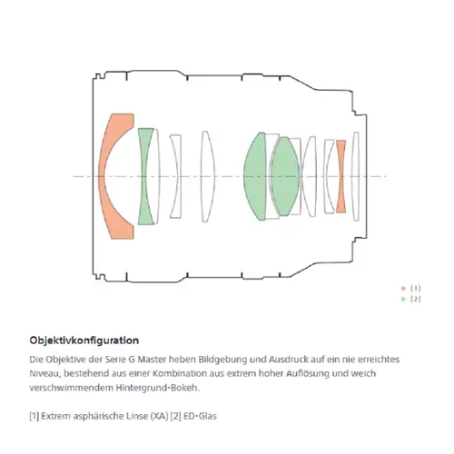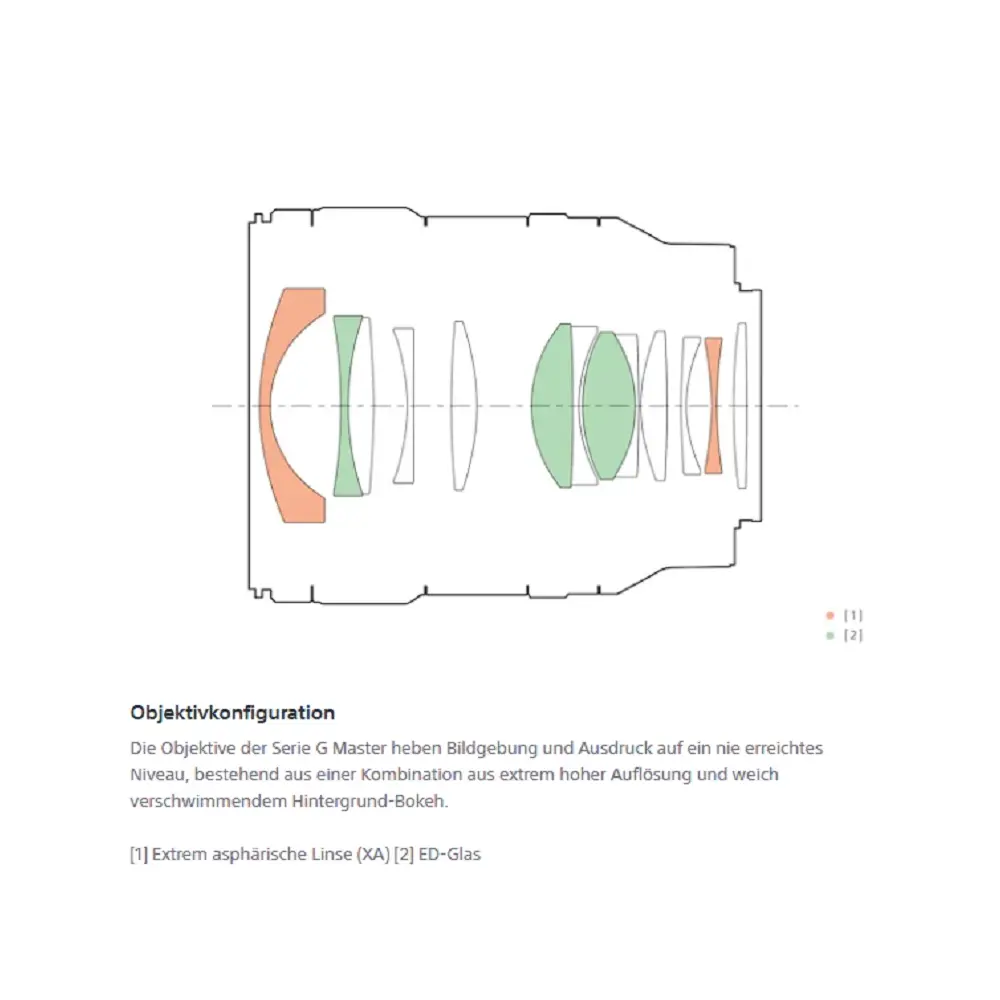 Zwei XA-Elemente im optischen Design, das die strengen Anforderungen von G Master erfüllt, sorgen für eine gleichbleibend hohe Auflösung über den gesamten Bildbereich hinweg. Drei ED-Glaselemente sorgen außerdem für eine effektive Reduzierung von chromatischen Abbildungsfehlern. Dieses Design minimiert sagittale Reflexionen und ermöglicht somit dramatische Perspektiven.